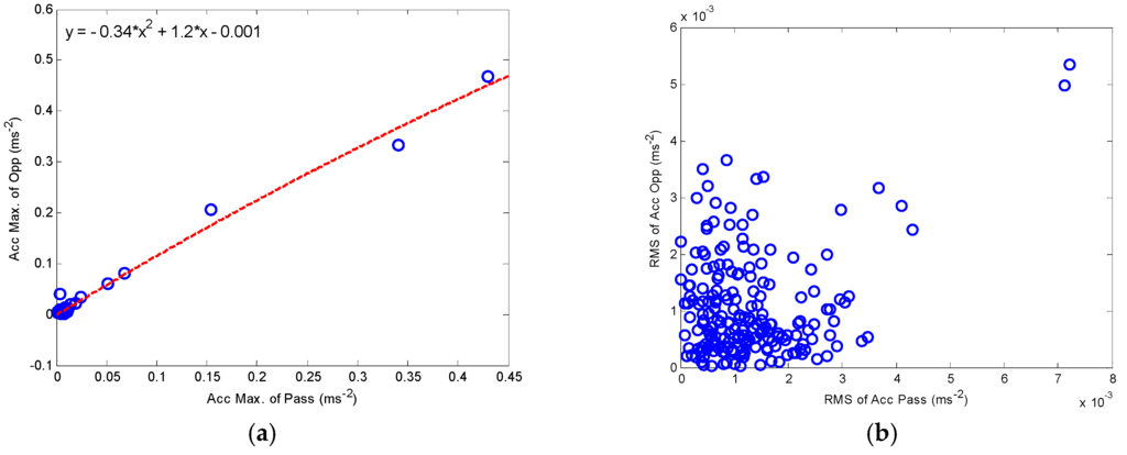 Cross-correlation between the passage and opposite way responses for 360 km/h. (a) cross-correlation maximum acceleration; (b) cross-correlation roote mean square (RMS) acceleration.