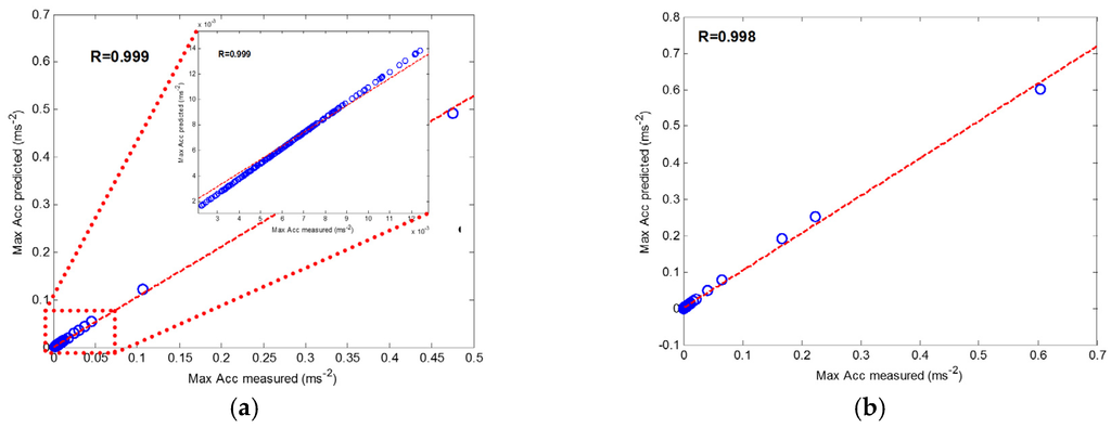 Predicting the effect of cross-correlation between maximum values of accelerations by using quadratic polynomials. (a) 400 km/h; (b) 406 km/h.