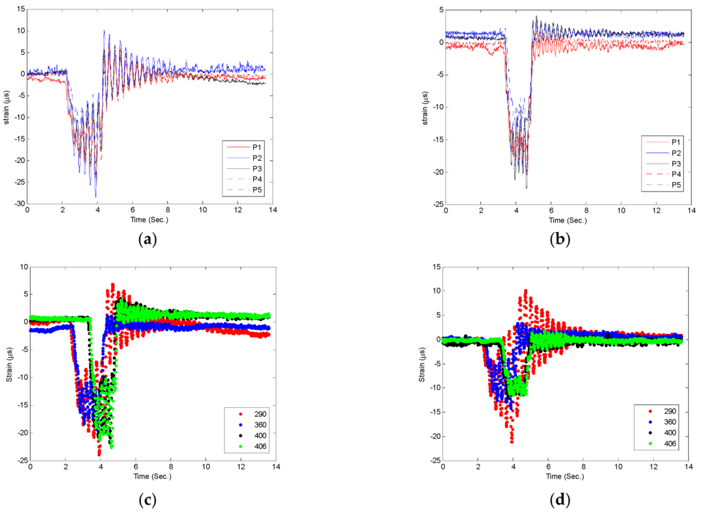 Strain measurements of the main girder induced by high-speed train. (a) passing response points for 290 km/h; (b) passing response points for 406 km/h; (c) passage response mid span points; (d) opposite response mid span points.