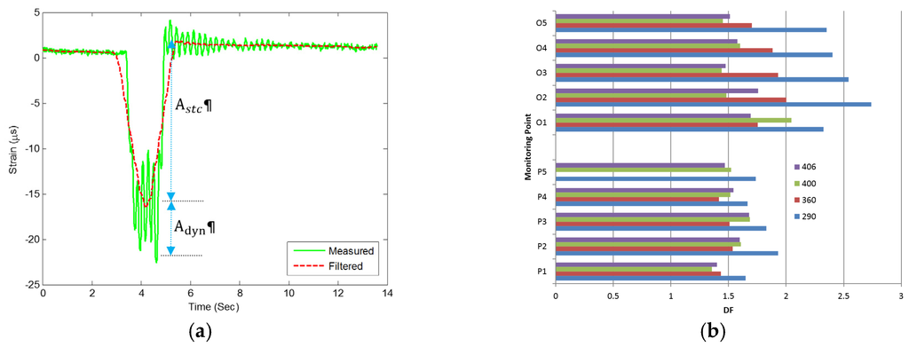 where and are the maximum absolute of dynamic and static amplitude of the strain, as shown in Figure 10a. The dynamic factors of passage (P) and opposite (O) directions for the monitored points are illustrated in Figure 10b.