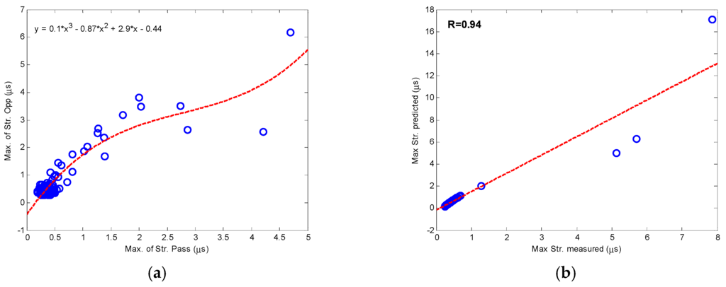 Herein, the cross-correlation evaluation is used to predict the dynamic behavior of strain contents. The same conditions used in the acceleration analysis are used in this part. Figure 11 presents the cross-correlation and the cubic fitting of the maximum dynamic of strain measurements. The relationship between the maximum dynamic of strain contents in the passage and opposite directions for the train speed of 360 km/h is illustrated in Figure 11a. While Figure 11b shows the prediction of the opposite direction contents of the dynamic strain for 406 km/h, the statistical analysis of cubic and quadratic fitting shows that the correlation coefficient of quadratic is 0.90, so the cubic fitting in this case is better to predict the dynamic behavior of the strain contents. The comparison between the results of acceleration and strain dynamic contents shows that the dynamic evaluation of acceleration is better and effective to assess the vibration of the bridge, but the strain dynamic contents can be used to decrease the monitoring cost.