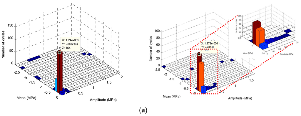 To perform fatigue evaluation, a simplified rain-flow cycle counting algorithm was used first to process strain history data and the spectrum of stress matrix obtained by statistical analysis [17,24]. The spectra of stress matrix calculated using the strain history data with train speeds of 360 and 406 km/h for the passage (left) and opposite (right) as shown in Figure 12, respectively.In addition, the maximum stress cycles are presented in Figure 12. It is observed that the maximum stress amplitude, obtained from strain history curves under two trains’ effects for the passage and opposite directions, is smaller than 2.5 MPa. Therefore, only a small number of stress cycles occur at the higher stress range. Most cycles occur in the region of stress mean and amplitude from −0.5 to 0.5 MPa and 0 to 0.5 MPa, respectively. Thus, the mean and amplitude values of the stress for the two trains in the two directions are equal.
