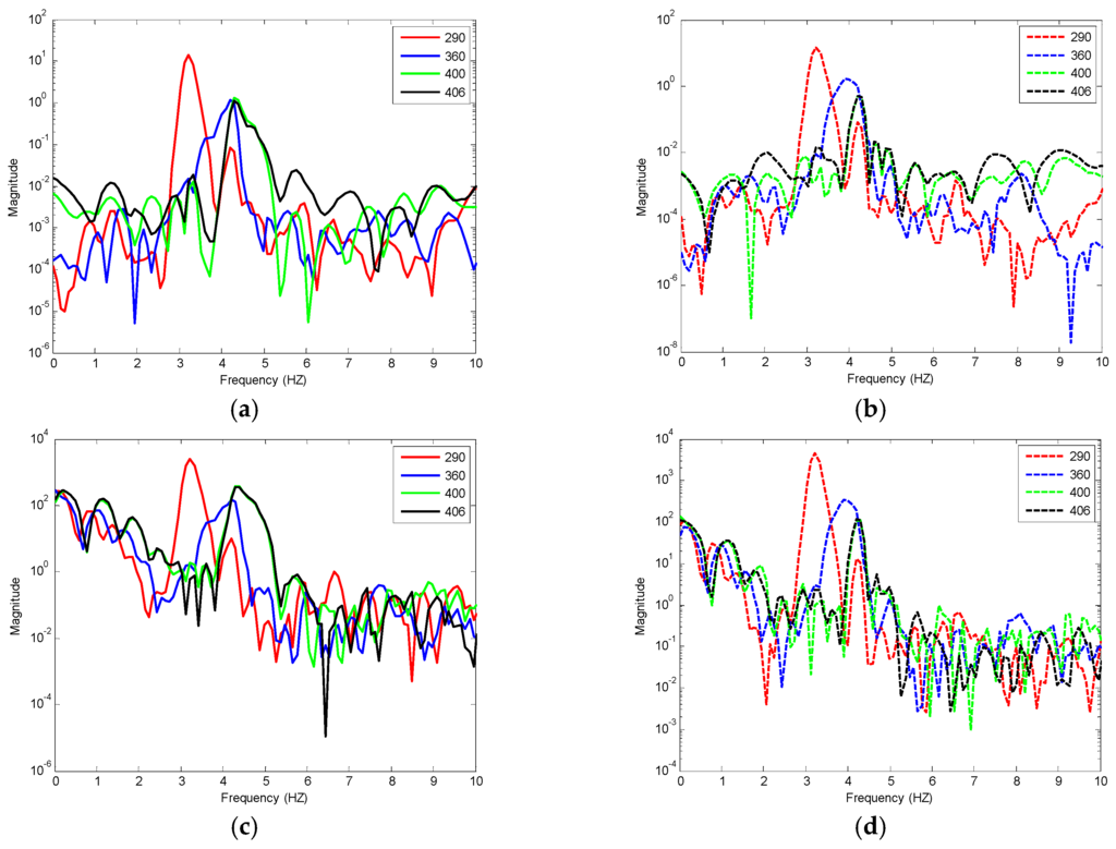 Acceleration and strain frequency contents. (a) passage-acceleration; (b) opposite-acceleration; (c) passage-strain; (d) opposite-strain.