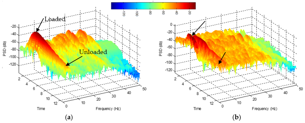 The Matlab Spectrogram toolbox is used to extract the three dimensional time-frequency maps for the passage train at the mid-span point of the bridge at speeds 290 and 406 km/h, as shown in Figure 14. The results show that the power spectrum density (PSD) at 290 km/h speed is lower than the PSD amplitude at 406 km/h. The PSD frequency responses’ amplitude differences between trains passage and departure (load and unload) show small values at 406 km/h. Therefore, it is concluded that the dynamic behavior of the bridge at train speeds of 406 km/h is greater than the 290 km/h. However, it is concluded that the bridge is safe at a speed of 406 km/h, but it should be continuously monitored if trains speeds are increased above this value. Moreover, the increase of PSD with train speeds indicates that the simple beam girders of steel bridges are very sensitive to train induced vibrations, and, therefore, may be not suitable for an increase in the speed of train traffic.