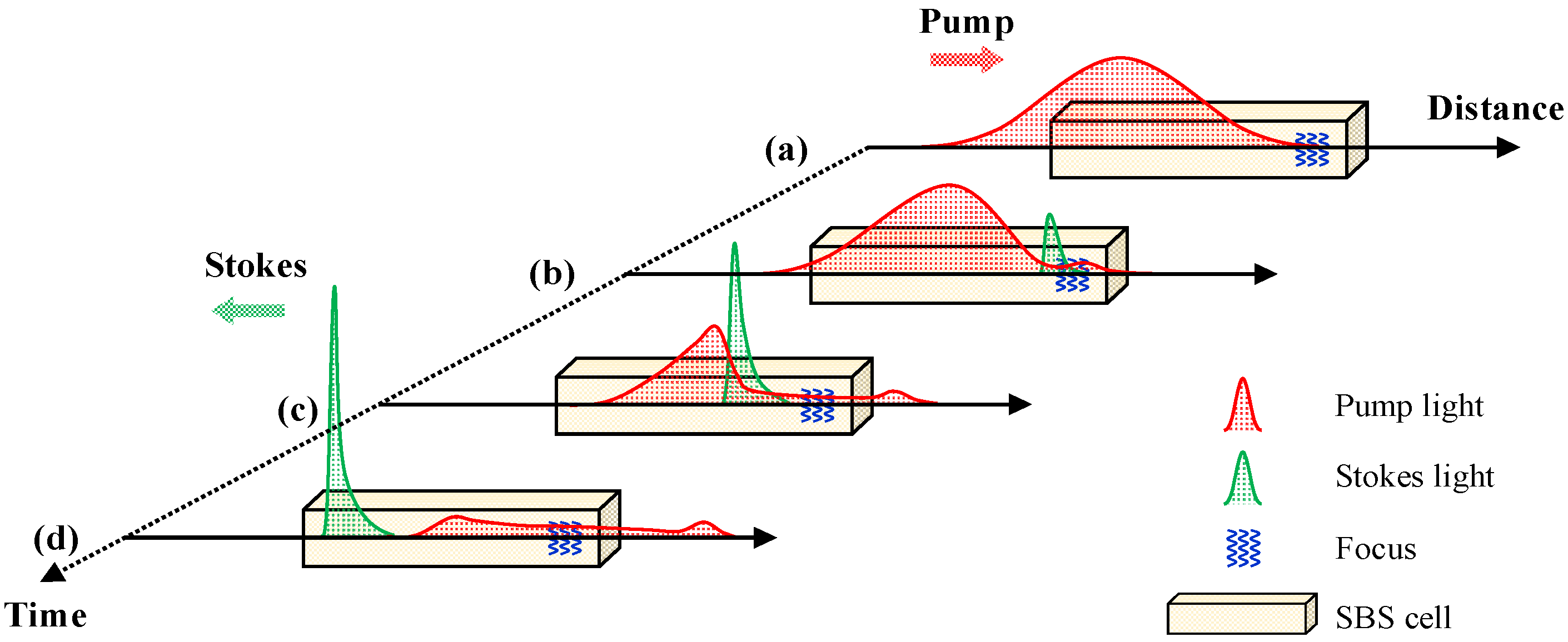 Temporal schematic diagram of simulated Brillouin scattering (SBS) pulse compression process (a) pump light incident to the SBS Cell; (b) backward Stokes light produced near the focus; (c) pump light energy transfer to the leading edge of the Stokes light; (d) compressed Stokes light obtained with a sharp rising edge.