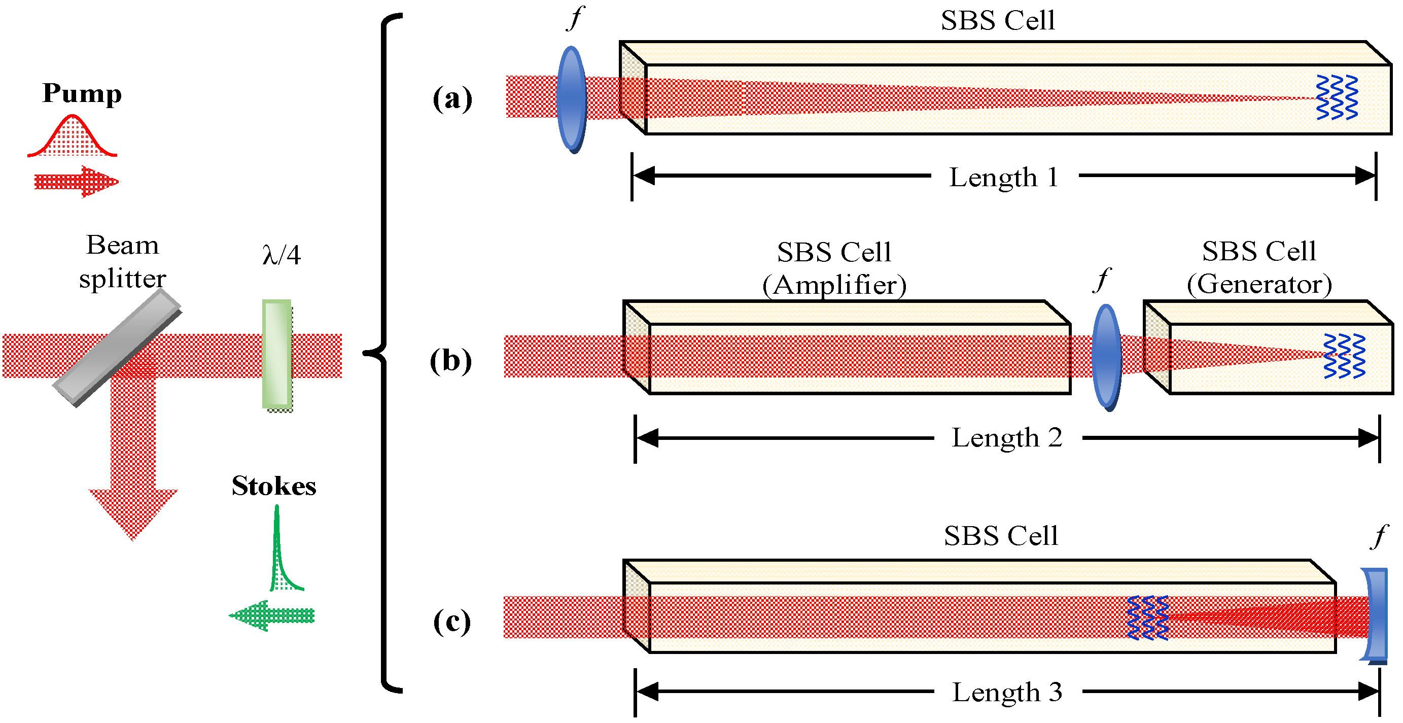 The stimulated Brillouin scattering (SBS) phenomenon was discovered decades ago and has been widely used in phase stabilization, pulse compression, beam combination and ultrafast pulse shaping [13]. Among them, in the field of laser pulse compression, SBS is an effective method to compress a long pulse for its high energy reflectivity and high compression ratio. In particular, SLM output can be obtained by SBS pulse compression due to the Stokes spectrum is the result of convolution of the pump spectrum and the SBS medium gain spectrum. The temporal schematic diagram of SBS pulse compression process is shown in Figure 1. The medium of SBS cell can be liquid, gas or solid. By SBS pulse compression, Stokes light with pulse width of few and sub- nanoseconds can be obtained [14,15,16]. In order to achieve pulse compression, different types of SBS compressor were designed including taped waveguide, one-cell geometry, oscillator amplifier, compact two cell, scalable two cell, and so on. Three kinds of the most widely used structures are schematically depicted in Figure 2. Figure 2a shows the original single-cell pulse compressor with long focal-length lens. This structure suffers disadvantages of easily occuring optical breakdown and low compression ratio that make it unsuitable for practical application [17,18]. Figure 2b is the basic two-cell structure with two separate cells: one relatively short cell as a generator, and the other as an amplifier. A short focal lens is adopted to obtain higher reflectivity with less sensitivity to injected energy. In order to ensure the amplification effect, length of the SBS cell in Figure 2a,b should be no less than shortest theoretical length L: