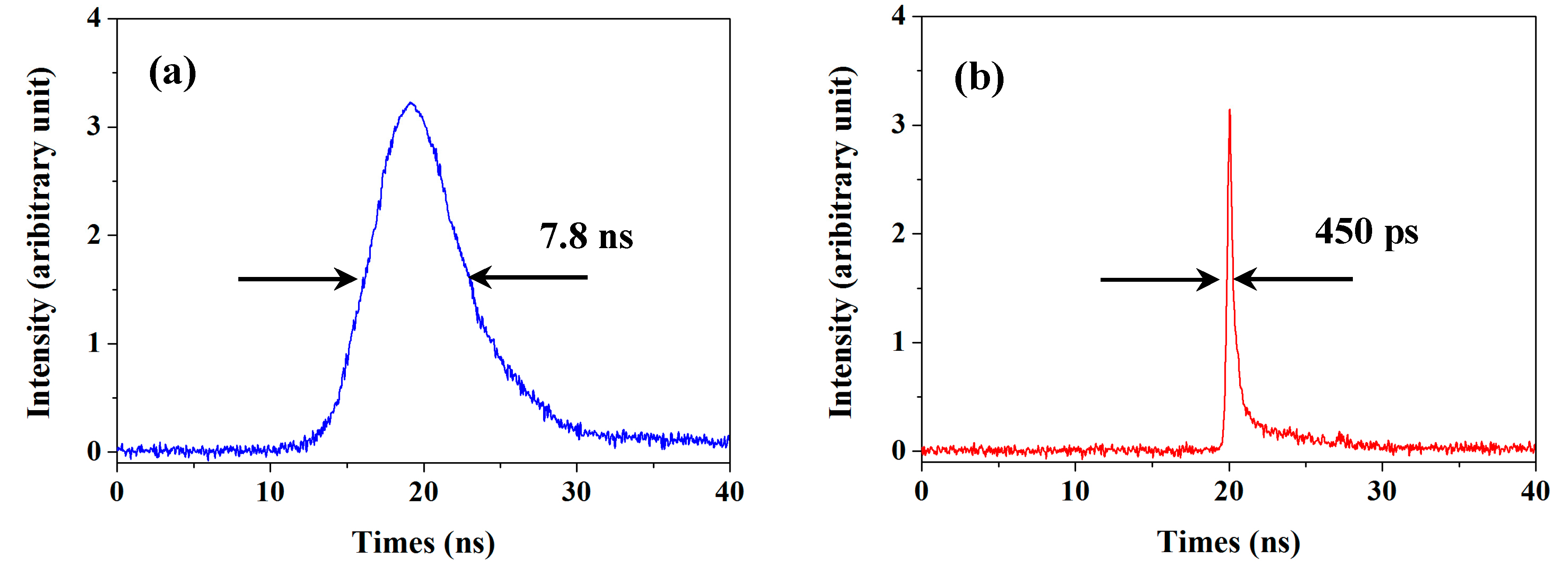 Temporal pulse profiles of the (a) SLM oscillator seed output; (b) SBS pulse width compressed output.