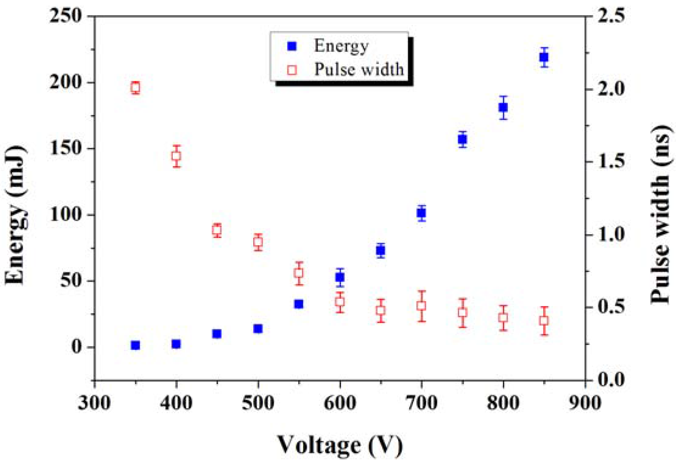 Figure 5 represents the experimental curve of output energy and compressed pulse width with the change of amplifier voltage, as well as the energy and pulse width stability (error bar). From the curve, we can see that the output energy is near linear growth from 650 to 850 V. One major reason is that with the increase of the injected energy, the SBS reflectivity is obviously improved. The reflectivity we obtained is higher than 75% when the voltage exceeds 650 V. Correspondingly, the output pulse width narrows down rapidly while improving the amplifier voltage from 350 to 650 V. This is because that, at this stage, the leading edge of the Stokes pulse is amplified greatly due to the fast growing gain of the compressor. However, from 700 V to higher voltage, no obvious pulse width compression or changes were observed. The mean reason for the increasing energy contributes little to the compression process is that the Stokes pulse width is close to the FC-770 medium phonon lifetime. The measured root mean square error (RMSE) of output energy at 850 V is less than 3%.