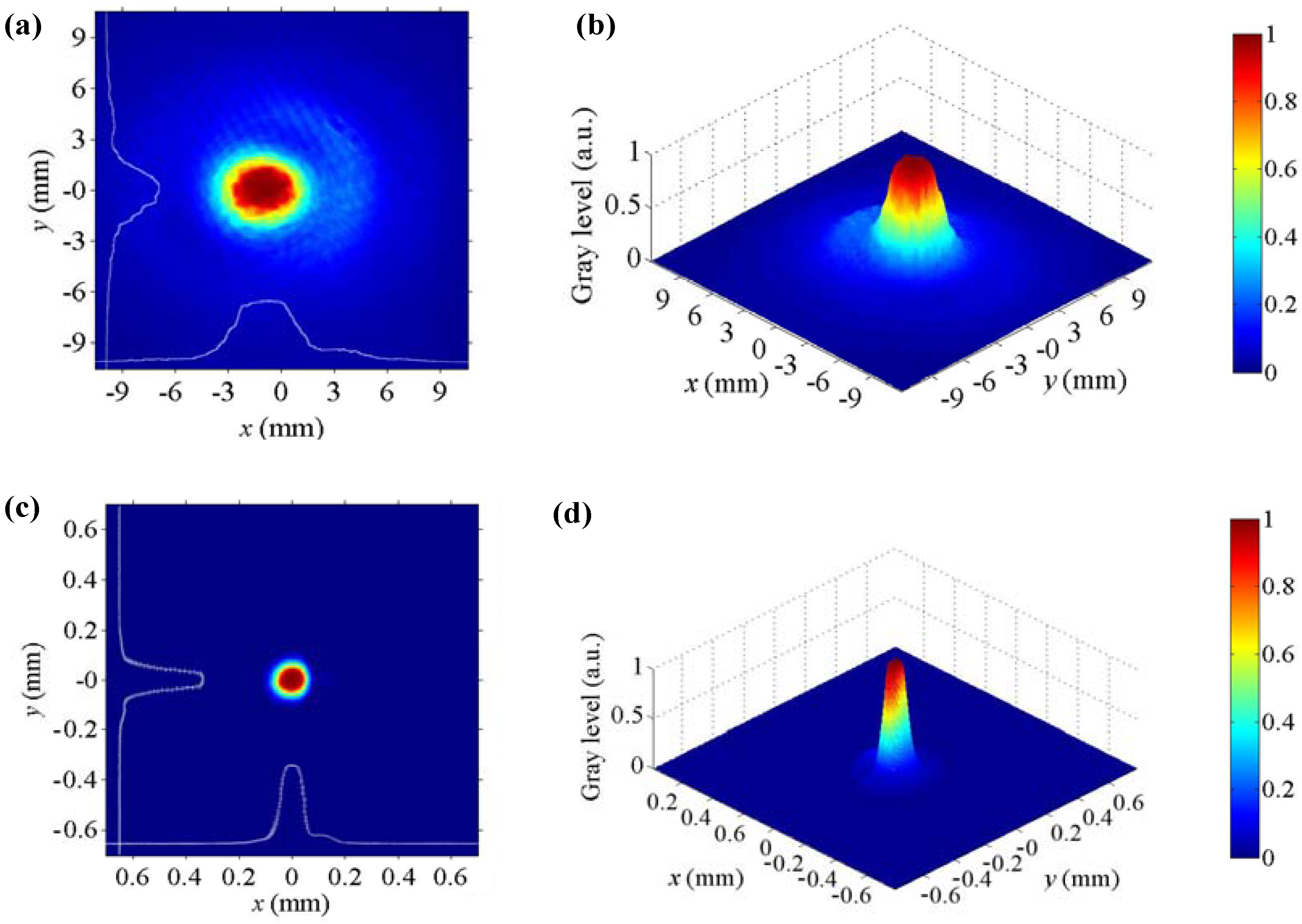 Intensity distribution of SBS pulse width compressed output (a) 2D distribution of near-field; (b) 3D distribution of near-field; (c) 2D distribution of far-field; (d) 3D distribution of far-field.