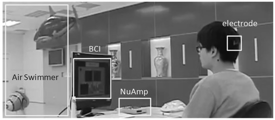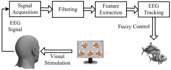A block diagram of the proposed system is shown in Figure 1. First, the subject sits on a chair in front of an LCD screen and focuses on the flickering boxes that appear on the screen. Second, the EEG signals are acquired using electrodes placed on the occipital region of the subject’s head. Third, the preprocessing step of the EEG signal removes noise from the signal. Fourth, the features of the EEG signal are extracted by using FFT to derive the energy of each stimulus frequency. Finally, a fuzzy tracking and control algorithm is applied to recognize the appropriate response, which is used to control the air swimmer drone vehicle. A detailed description is provided in the following subsections.