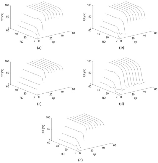 Recognition rates for (a) TriaMF; (b) TrapMF; (c) GbellMF; (d) GaussMF; and (e) Gauss2MF. RD, RF, and RR are the output range of defuzzification, the input range of fuzzification, and recognition rate, respectively.