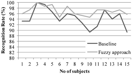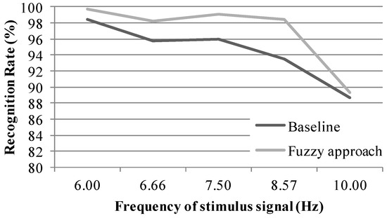 where . H, P, and F are the number of harmonics, the number of points for an input signal, and the sampling rate, respectively. The number of harmonics, H, was 4 in this experiment. The experimental results of the fifteen subjects are shown in Figure 7. The recognition rates were 94.49% and 96.97% for the baseline and the fuzzy approach, respectively. The recognition rate of the proposed approach for each subject was clearly higher than that of baseline. To examine the experimental results, a Wilconxon's signed-rank test was adopted, and the two-tailed test p-value was approximately 0.002. Thus, at a signification level of 0.01, the results we obtained surely indicate that the recognition rate of the proposed approach is higher than that of CCA. Therefore, the proposed approach is an excellent solution for correctly recognizing the frequency response of the visual stimulation.