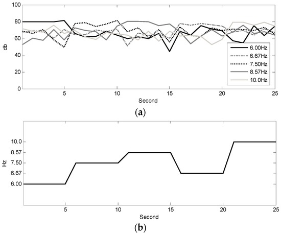 To analyze the effects of the visual stimulus frequency, the experimental results for different stimulus frequencies are shown in Figure 8. The results indicate that, when the stimulus frequency increased, the recognition rates were slightly degraded. To determine the cause, the normalized amplitude at the stimulus frequency, which reflects the SNR of the SSVEP, can be calculated as follows: