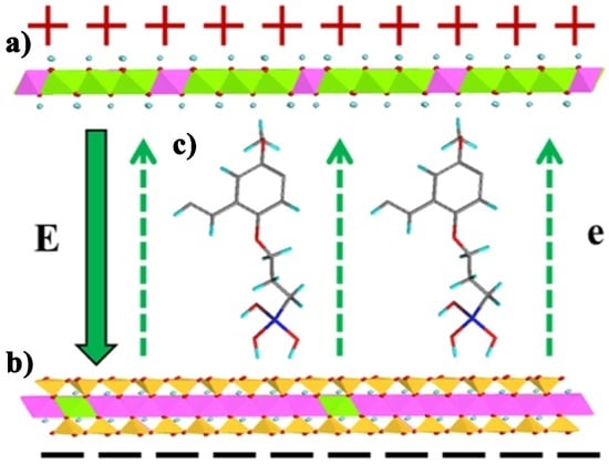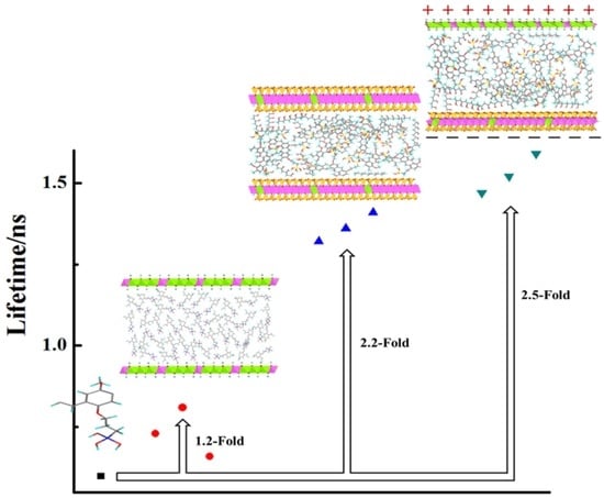 Recently, our group has successfully verified that an electronic microenvironment (EME) can enhance the multilayer films’ lifetimes containing cationic chromophores about 40-fold as long as those of the original powders [16]. Exfoliated LDHs and MMT nanosheets constructed a nano-system via LBL method, and then EME can be formed by the oppositely-charged rigid inorganic nanosheets between the interlayers, as shown in Figure 1. The nano-system structure is like a traditional capacitor’s structure, in which the positive LDHs nanosheets are used as positive plates of capacitors and negative MMT nanosheets are as negative plates of capacitors. Between the interlayers, the EME can be provided. At the same time, we also confirm that the ferromagnetic effect, which is formed by transition metal-bearing LDHs nanosheets, is fairly conducive to enhancing the lifetimes of multilayer films, and better photoemission behavior is obtained thanked to the double coupling effects of EME and magnetic field [17,18]. However, the novel concept has only been clarified in several nano-systems, but the questions of whether EME’s effect is endowed with universality for all chromophores, and whether it can also be solely beneficial to the lifetimes of multilayer films containing the anionic luminescent polymer except nanosheets’ ferromagnetic effect, need to be clearly explored imminently.