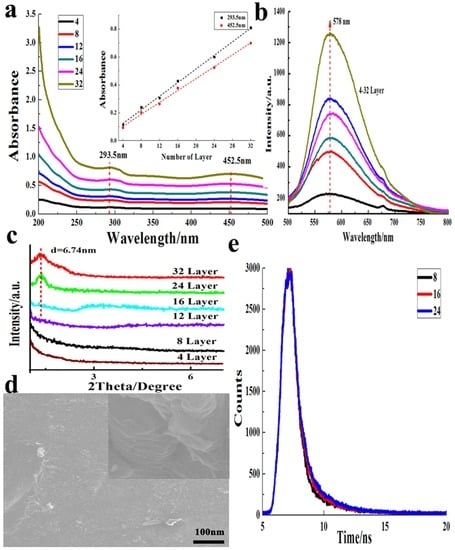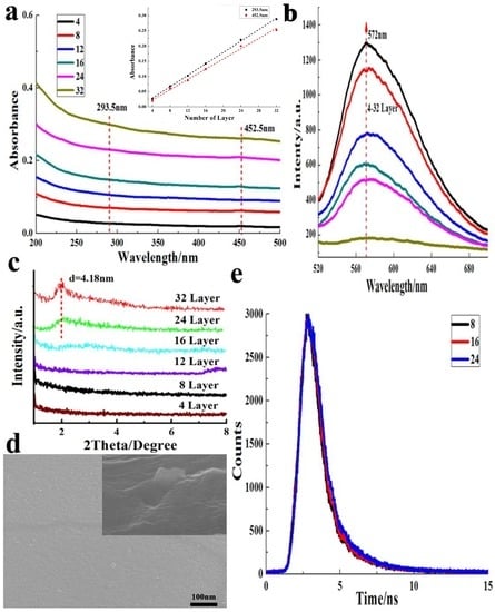 Characterization of (MMT/APPV@PVA)n (MA(n) films) (a) UV-vis absorption spectra (the inset shows the absorbance at 293.5 nm and 452.5 nm increasing linear relationship; (b) fluorescence spectra; (c) Small angle X-ray Diffractometer (XRD) patterns; (d) Scanning Electron Microscope (SEM) images of the thin films surface, and the inset show the thin films’ cross sections; (e) Fluorescence decay profiles.