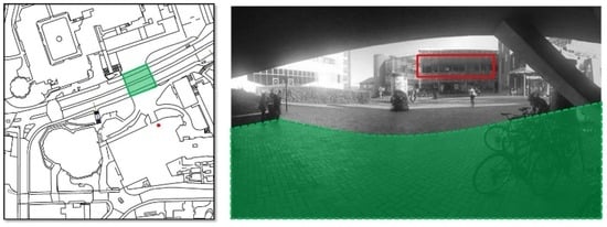 Plan of the site (left); the green area shows the observation area (underneath the Concourse Bridge); the red dot shows the location of the cameras used for video recordings in the Students’ Union building (right)—See also details in Section 2.2.