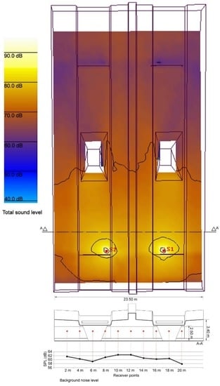 Sound pressure level (SPL) distribution simulation with location of the hypothetical sound sources (loudspeakers) and section with location of the microphones and corresponding background noise levels.