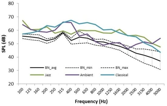 One-third octave band spectrum of the background noise (BN) level (black line) averaged over the ten recording points reported in Figure 2, with minimum and maximum values (dashed lines), compared with the spectra of the three music excerpts (hypothetical broadband sound pressure level of 75 dB).