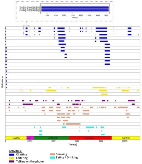 The video recordings were used to investigate peoples’ behaviour in response to sound. Direct observational assessment of people behaviours was performed by means of the Behavioural Observation Research Interactive Software (BORIS, v. 2.95, University of Torino, Torino, Italy) [30]. In each BORIS project, information related to a set of observations (such as Behaviours and Participants) are manually annotated through computer vision and respectively inserted in the Ethogram and Subjects table. Ethograms consist of a list of behaviours exhibited by an individual or a group, with corresponding definitions of each using descriptive terms and phrases [31,32]. The ethogram reported in Figure 4 shows the duration of stay (in seconds) of all stopping subjects for a corresponding observation period. For each stopping subject, three more attributes were annotated, namely: (1) Activity (Chatting/Eating-Drinking/Loitering/Smoking/Talking on the phone), related to the main activity carried out by the subjects during their stay; (2) Group (alone/group) related to whether the subjects were staying alone or in group; and (3) Posture (sitting/standing), related to whether the subjects were sitting or standing. Furthermore, the number of passers-by under the bridge was registered in terms of point behaviours (no duration) to examine the total number of subjects passed during the corresponding stimulus condition.