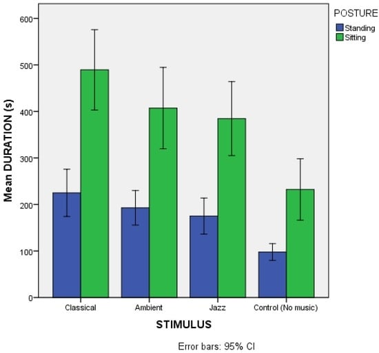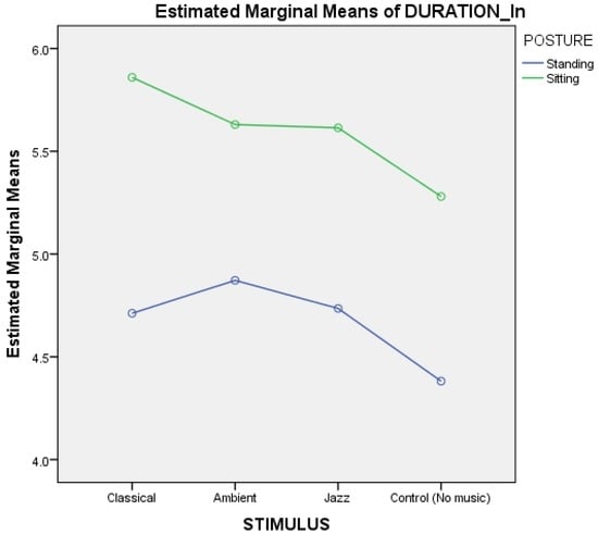 3.2.2. Combined Effect of Posture and Music on Duration of Stay