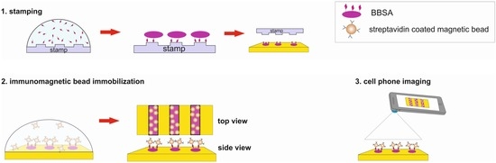 Illustration of the micro-contact printing on gold slides, self-assembled immunomagnetic beads on the printed receptors and cell phone imaging.