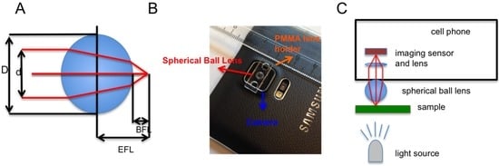 Cell phone microscope using a spherical ball lens. (A) Illustration of the important parameters of the spherical ball lens; (B) Image of the cell phone microscope; (C) Schematic of the measurement.