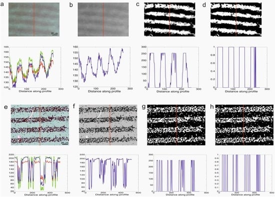 Images of certain micro-contact printed lines acquired by reference microscope and cell phone microscope, pixel intensity variations along the profile line below each image. Top row images acquired by cell phone microscope, bottom row images acquired by reference microscope: (a,e) original image; (b,f) greyscale image; (c,g) after the dilation and adjustment steps; (d,h) binary image. Magnetic bead concentration was 0.67 mg/mL.
