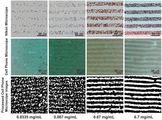 We converted the RGB image to a binary image using ImageJ software [21] and measured the pixel area of the magnetic beads. In an area of 1000 μm2, 5057 pixel area represents the amount of magnetic beads that captured 700 fM of folate receptor. The binary images presented in Figure 4 for 0.067 mg/mL of streptavidin coupled magnetic beads correspond to a white pixel area of 1032 in an area of 1000 μm2 for the images acquired by the cell phone microscope.