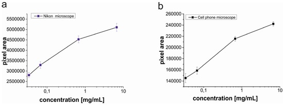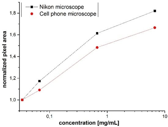 The trends of pixel areas changing with respect to the magnetic bead concentration are similar for both microscopes. To compare the variation of the pixel area with respect to the concentration for both microscopes, pixel areas were normalized by dividing each pixel area by the pixel area corresponding to the lowest concentration (0.0335 mg/mL) of magnetic beads (2805505 for the Nikon microscope and 148036 for the cell phone microscope). Figure 6 shows the normalized pixel area of the magnetic beads for various concentrations.