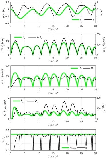 The system’s overall efficiency is heavily influenced by the efficiency of each sub-unit. This is due to the OWC-WEC attaching to the total system in the order of chamber-turbine-generator. The chamber and turbine, which are the first sub-units, are directly affected by the physical damping term that is produced from the generator and have a mutual influence on each other. Therefore, it is difficult to strategize a real-time method to maximize the entire system efficiency. Otherwise, analysis of the time domain is subject to the Newtonian mechanics, and it does not require the constant angular speed of the turbine that was assumed in the frequency domain analysis, since the angular acceleration level of the turbine can be addressed in the Newtonian mechanics.