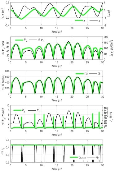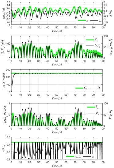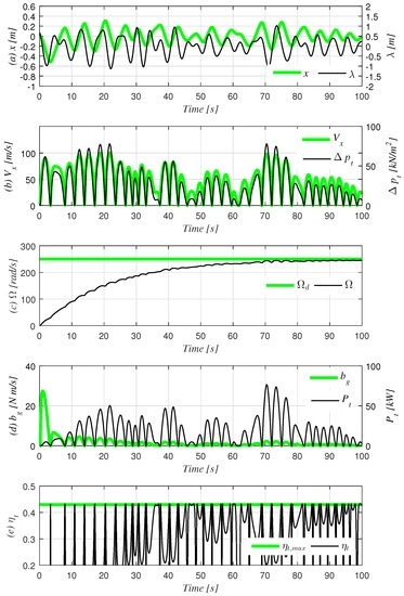 Section 4, the turbine’s instant efficiency was at its maximum within its functional intervals. Since tracking the turbine’s maximum efficiency does not guarantee the optimal operation of the WEC-system as a whole, we compared the power extraction obtained by the controllers with the maximum power extraction that has no control under a constant damping coefficient with irregular waves that have varying wave heights and periods.