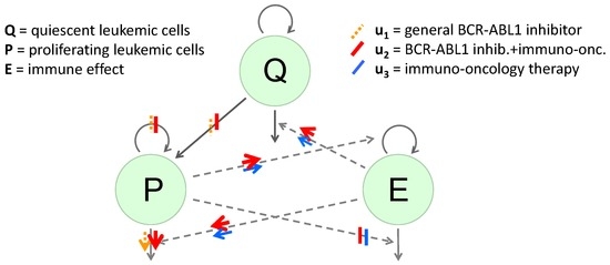 Let Q be the concentration of quiescent leukemic cells, P the concentration of proliferating leukemic cells, and E the strength of immune system effects. We will consider E to represent effector T cell concentration levels, and will refer to E in the remainder as a concentration of effector T cells. The model contains three controls , and that all denote normalized levels of different therapies. The roles of the specific drugs are illustrated in Figure 1 taken from [12] with arrows indicating amplification of effects and vertical bars indicating inhibition. The control represents the normalized concentration of a BCR-ABL1 inhibitor (such as imatinib) that mainly has an inhibitory effect on the highly-proliferating leukemic cells; is a BCR-ABL1 inhibitor that inhibits BCR-ABL1 that also has immune effects (such as dasatinib); while represents an immunomodulatory compound (such as nivolumab).