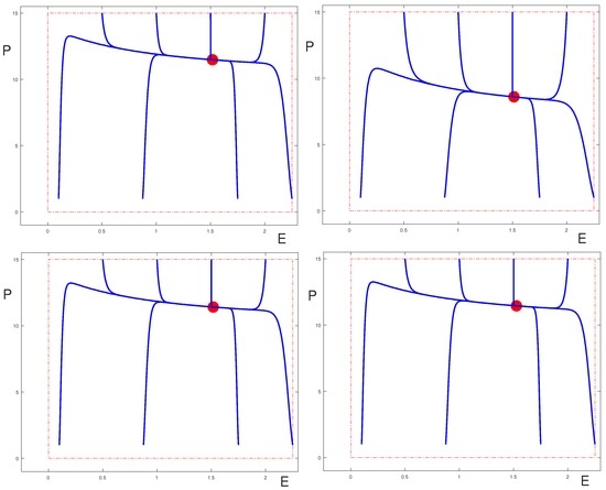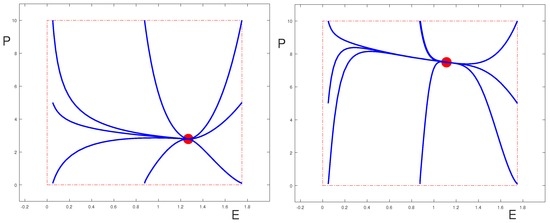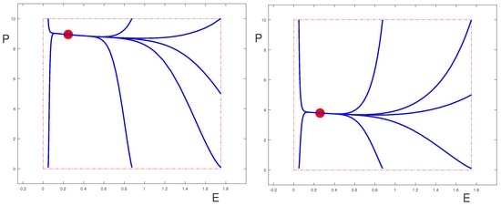 is positively invariant for the dynamics. This is because the planes and are invariant under Equations (6) and (8) and whenever . Thus, starting at a positive initial condition , it follows that the solutions remain positive for all times. For the long-term behavior of the system, the equilibrium solutions in the closure of , , also matter. Recall that the system is defined and continuous on due to the use of the limits as and in place of and , respectively. The vector field defining the P and E dynamics is not continuously differentiable at or , but these values are repelling and thus this does not become an issue.