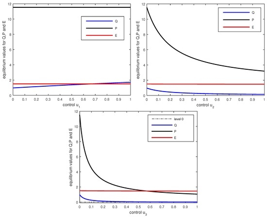 Figure 4 shows how the positive equilibrium values change as (only) one of the controls is varied. Note that the equilibrium values for Q and E do not change if only the control is varied. Also for changes in the controls and these equilibrium values change little and in the graphs the corresponding curves are almost constant. However, in these cases the equilibrium values for Q and P are well-controlled by the therapies. Contrary to the case when , the and controls have strong effects by cutting down the influx of cells from the Q into the P compartment. All equilibria shown in these graphs satisfy the conditions of Theorem 2 and are locally asymptotically stable.