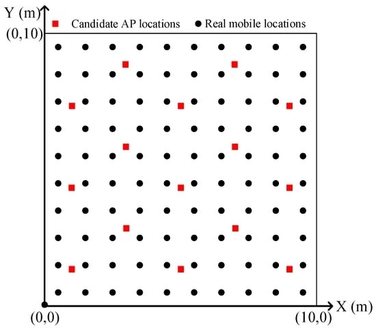 We conduct the simulations in a Line-Of-Sight (LOS) environment with the dimensions of 10 m by 10 m. The 100 and 15 candidate mobile (with a 1-m interval) and AP locations are uniformly calibrated in the target area, as shown in Figure 2. In the simulations, we set , , and , which are also used in []. For the sake of investigating the impact of AP number and noise power on the error bound and Fisher information, we calculate the error bound, , for the target area by: