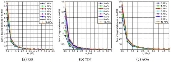 Figure 3 and Figure 4 illustrate the sum of diagonal elements in the FIM, which represents the Fisher information with respect to the metrics of RSS, TOF and AOA and the corresponding error bounds. In Figure 3, the metric of AOA is verified to be able to provide much more Fisher information compared with the metric of RSS or TOF. In addition, the larger number of APs results in the higher Fisher information as expected. Figure 4 shows that the error bound increases consistently as the variance of the metric of RSS, AOA or TOF increases. Furthermore, we also find that the smaller variance of the metric of RSS, AOA or TOF corresponds to the higher Fisher information and lower error bound in indoor localization.