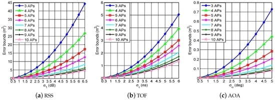 Based on the previous discussion in Section 3, the deviation of the metrics of RSS, AOA and TOF (or called noise power) determines the values of , and and thereby affects the error bound. Then, in this section, we will focus on the impact of the deviation of the metrics of RSS, AOA and TOF on error bounds.