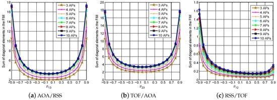 Sum of the diagonal elements in the FIM by using the hybrid (a) AOA/RSS, (b) TOF/AOA and (c) RSS/TOF.