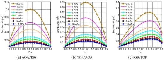 Figure 5 and Figure 6 illustrate the Fisher information provided by different metrics of double measurements and the corresponding error bounds. In the simulation, we set , and . From these figures, the metric of TOF/AOA can be verified to perform best in providing the most Fisher information. Similarly, the larger number of APs corresponds to the higher Fisher information and lower error bound. In addition, we can find that the increase of the absolute value of correlation coefficient generally increases the Fisher information, as well as decreases the error bound.