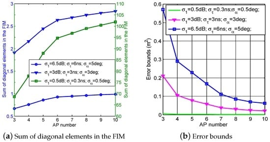 Figure 7 shows the Fisher information and the corresponding error bounds by the JMART. From this figure, we can find that the larger number of APs results in the higher Fisher information and lower error bounds’ indoor localization, which are in accordance with the results under the metrics of single and double measurement given above.