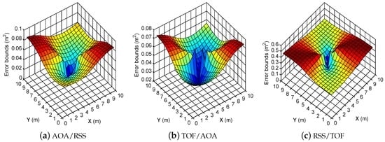 Error bounds by using the hybrid (a) AOA/RSS, (b) TOF/AOA and (c) RSS/TOF.