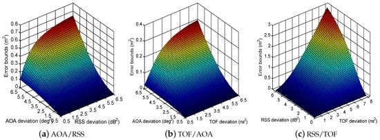 Figure 11 and Figure 12 show the Fisher information provided by using the metrics of AOA/RSS, TOF/AOA and RSS/TOF and the corresponding error bounds under different deviations of the metrics of RSS, AOA and TOF. From these figures, we can find that the Fisher information and error bounds are highly affected by AOA deviation, while the impact of RSS and TOF deviation on the Fisher information and error bounds is slight.