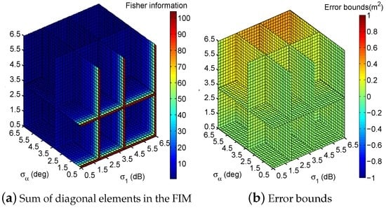 Finally, Figure 13 shows the variation of the Fisher information and the corresponding error bounds by the JMART under different deviations of the metrics of RSS, AOA and TOF. From this figure, we can find that both the Fisher information and error bounds are significantly determined by AOA deviation, which are in accordance with the results under the metrics of single and double measurement given above.