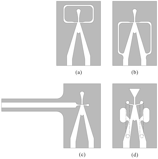 Four types of the bistable fluidic oscillators. (a) Relaxation bistable oscillator; (b) negative feedback bistable oscillator; (c) resonance-channel fluidic oscillator; (d) output-fed bistable oscillator.