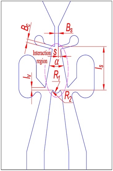 Main geometric parameters of the output-fed bistable fluidic oscillator; Bs—width of the supply nozzle; Ds—depth of the supply nozzle; Bc—width of the control nozzle; S—setback of the attachment wall; ls—nozzle-to-splitter distance; lv—vent-to-splitter distance; R1—radius of concave arc of the splitter; R2—radius of convex arc of the splitter; —the divergence angle of the attachment wall.