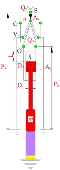 A schematic circuit diagram for the fluidic hammer.(S—Inlet of supply nozzle, C—Control nozzle, V—Vent, O—Output channel, Ps—Pressure drop between supply nozzle and vent, Po—Pressure drop between output channel and vent, Qs—Flow rate at the inlet of supply nozzle, Qo—Flow rate at the output channel, u—Mean flow velocity in the supply nozzle, v—Moving velocity of the impact body, As—Sectional area of the supply nozzle, Ap—Action area of the piston, Dp—Diameter of the piston, Dr—Diameter of the piston rod, m—Mass of the impact body, L—Stroke of the impact body).
