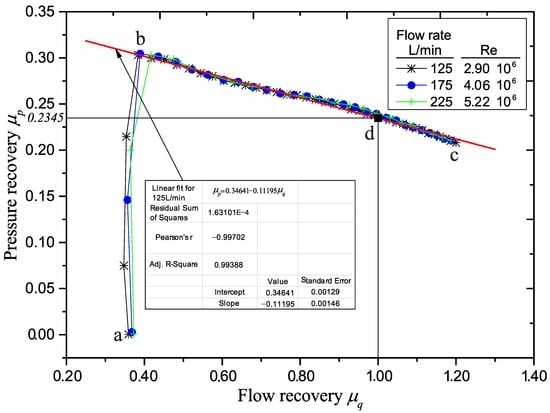 where the intercept of Equation (6) can be regarded as the value of the pressure recovery when the velocity of the impact body is 0 and thus all of the supply flow is discharged into the vents, and the slope represents a dimensionless characteristic coefficient between the pressure recovery and flow recovery.