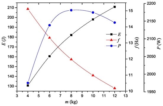 Figure 9 shows the computation results of the group including Cases 1, 10, 11, 12, and 13. As the mass of the impact body increases, the single-impact energy of the impact body increases while the impact frequency decreases. The output power of the fluidic hammer does not vary monotonically, and there exists a maximum value at m = 8 kg. In this group of computation cases, the cases of m = 8 kg or 10 kg shows better performance of the fluidic hammer, as both of their single-impact energy and output power is relatively high.