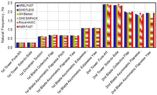 The natural frequencies of a flexible OWTG model supported by a monopile under stationary condition are shown in Figure 3. Merely the results of first two orders are provided because: (i) only the first two orders data are released by OC3; (ii) the analysis order higher than second order is prohibited by FAST; and (iii) the effect of high order against WTG operation can be ignored. The analysis results by INER are in good agreement with those by other OC3 research teams except for the second order natural frequencies of turbine structures. Since the natural frequencies evaluated by modal-based codes are generally higher than those by multibody-based or FEM (Finite Element Method)-based codes, analysis errors by different teams can therefore be exhibited in high order frequencies.