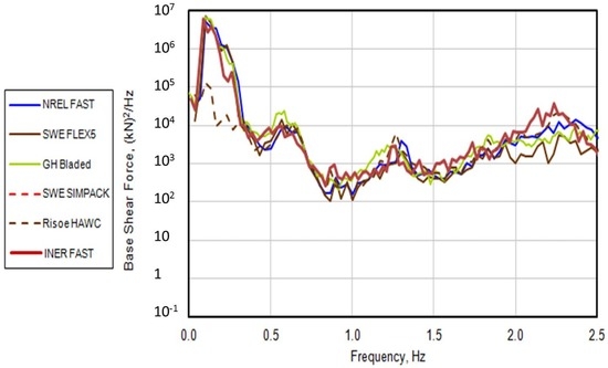 Power Spectra of Base Shear Force under Load Case 5.3 of OC3 Phase I.